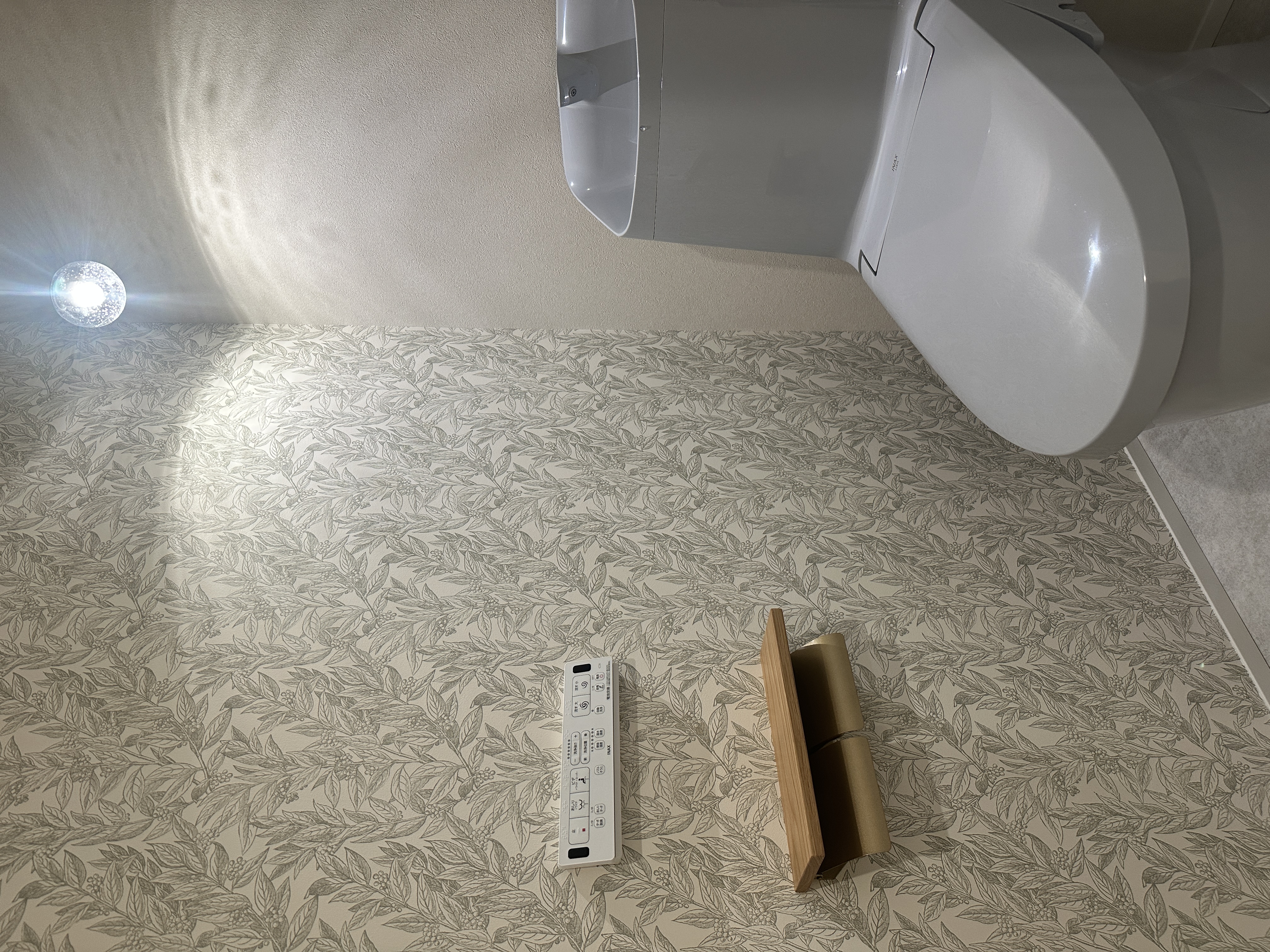 アクセントクロスと上からやさしく灯るライトが、落ち着いた雰囲気をつくるトイレ